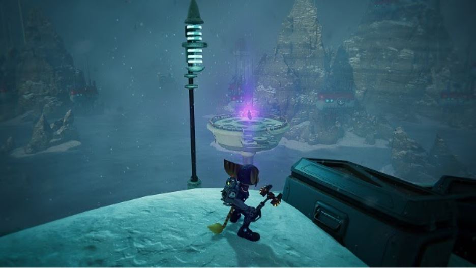 Go to the other side of the platform and use your Hoverboots to skate towards the snow mound. Leap into the air using your double jump. While your jump isn’t enough to reach the platform, a rift will allow you to teleport to the platform. Hit the blizon to reveal your first Gold Bolt in this area.
