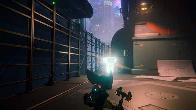 Once you on the higher level, Ms. Zurkon will alert you that there is a Spybot up the stairs and at the end of the path ahead, which is also where you’ll find the gold bolt.