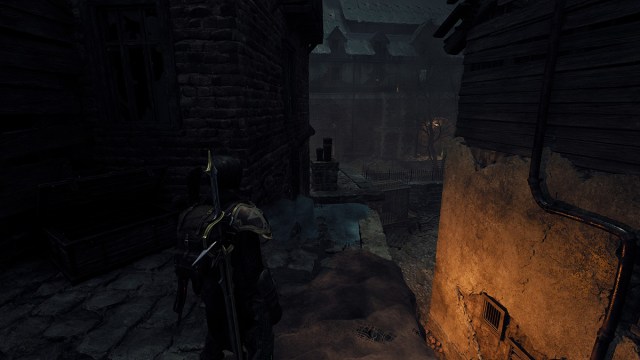 With both items equipped, climb up onto the ledge to the left of the courtyard gate. You’ll need to go up a nearby ladder to get up there.