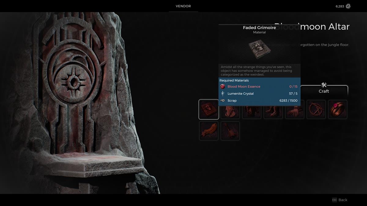Around the Bloodmoon Altar, you may notice wares that require Lumenite Crystals (dropped by elites), Scrap (dropped by most enemies), and Blood Moon Essence (which is what we’re looking for).