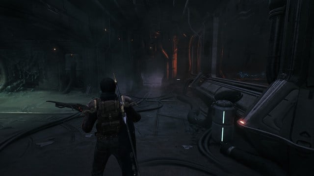From there, crouch down and walk until you can jump again, then climb a nearby ladder. You’ll find the first of two rings just off the beaten path. Once you have it, continue until you come to another drop-down — but don’t use it. Instead, look for a small opening in a nearby wall. You’ll see a pair of large cables, disconnected with a breakable barrel between them. Shoot the barrel to restore the connection and unlock the door.