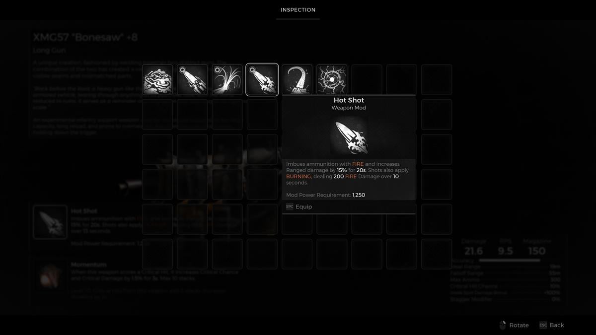- Firearm mod #1: Hot Shot or Corrosive Rounds – You really can’t go wrong with either of these picks. If you have a long gun with a high rounds-per-minute (RPM) stat, then activating the mod ensures that all the bullets you shoot have an elemental effect.