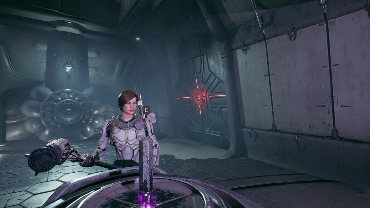 Jump down to find the Drzyr Replicator, a machine that lets you craft various goodies, such as rings, weapons, and amulets. The goal, however, is to check the room to the right. There, you’ll find a console.