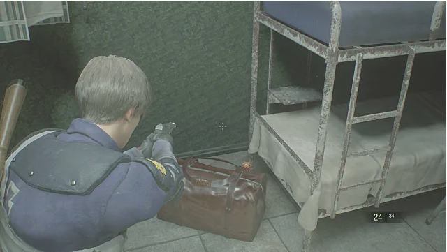 On Claire’s second run, or when Leon gets back from the parking garage, check out the Break Room in the east wing of the RPD. Mr. Raccoon is hiding behind a duffel bag at the foot of one of the bunk beds.