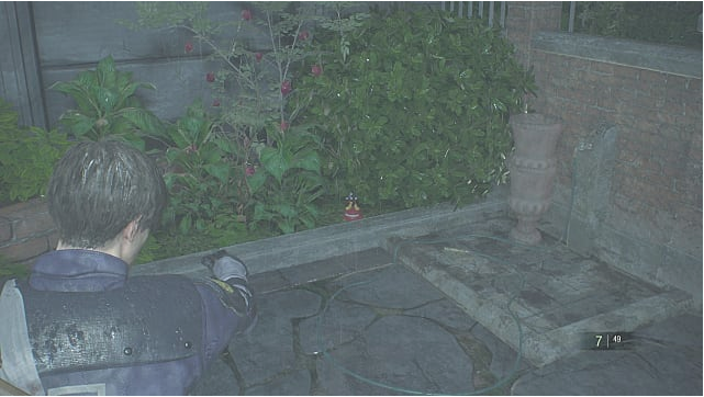 In the exterior Entrance area of the RPD, where a character begins the game on a second run, keep an eye on the bushes along the north side of the central path. The Statue is barely visible under a bush.