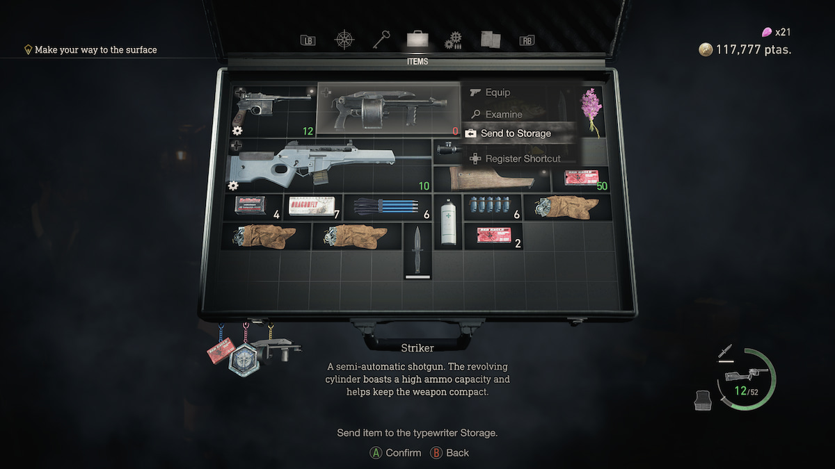 - Whenever you visit a Typewriter to save, there will be an option to enter the storage screen. From there, you can easily store weapons or add them to your Attache Case.
