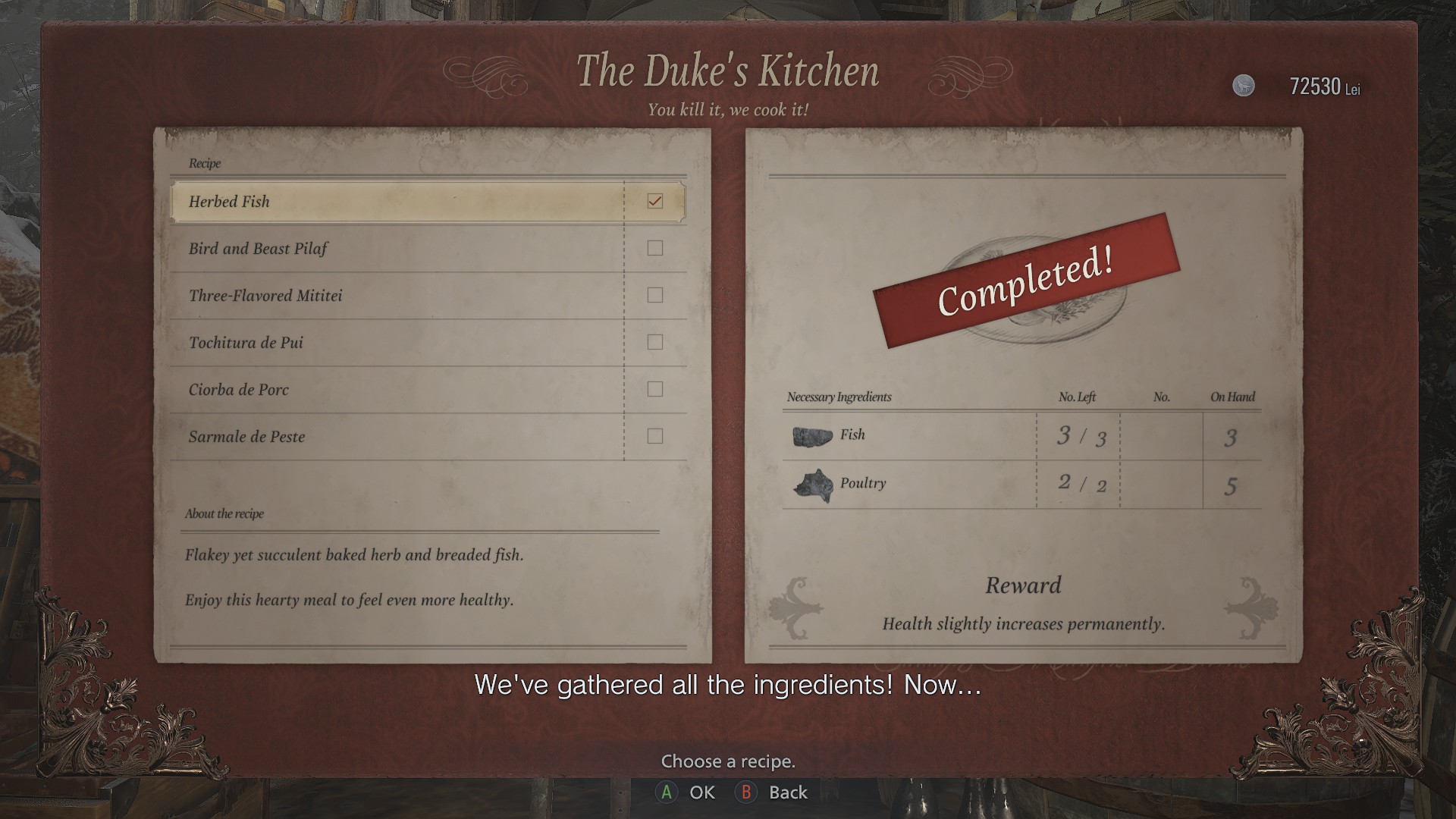 Herbed Fish: 3 Fish, 2 Poultry. Slightly increases maximum health.