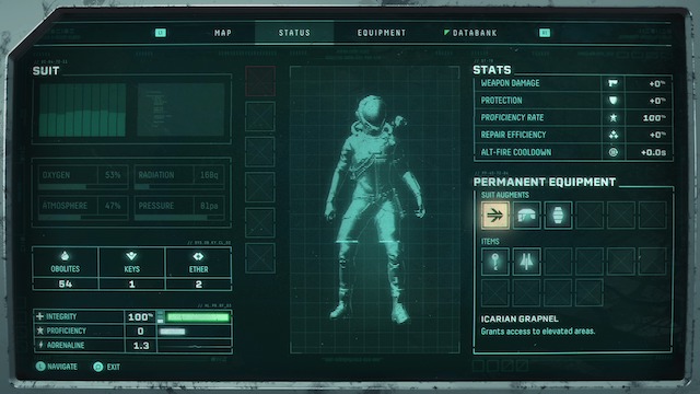 - This includes suit augments, such as the Icarian Grapnel and Weapon Charger. These items are essential for navigating certain areas of every biome.
