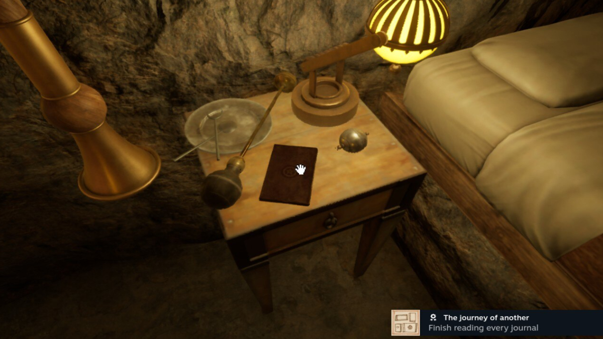 - A Great Deal of History (Missable): You’ll earn this achievement by watching Gehn’s imager recordings. To do so, find the imager device in Gehn’s sleeping quarters. Spin the crank to watch the first image recording. Then, read Gehn’s journal to find the page with the Imager Codes on it. You’ll need to determine each imager’s code by deciphering the D’Ni numbers. The code for each imager recording is (5), (2 and 3), (2, 3 and 5). To input these codes, look for the rectangle cutout on the base of the imager device. Click it, and it’ll pop out a tray with buttons. The buttons are numbered from 1 to 5, left to right.