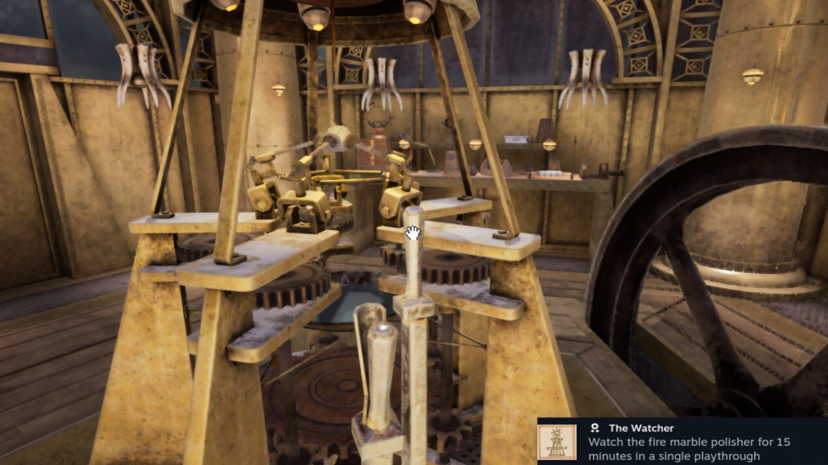 - The Watcher (Missable): You’ll need to watch the fire marble polisher for 15 minutes in the same playthrough to earn this achievement. Inside Gehn’s Laboratory, you’ll find the marble polisher in the center of the room. You’ll need to use the left switch to start the cogwheels and the right switch to spin the big wheel. Repeatedly pull the right lever to make the wheel spin faster, which will cause the machine to run longer. When watching the machine, ensure it is running; otherwise, your time watching it won’t count towards the achievement.