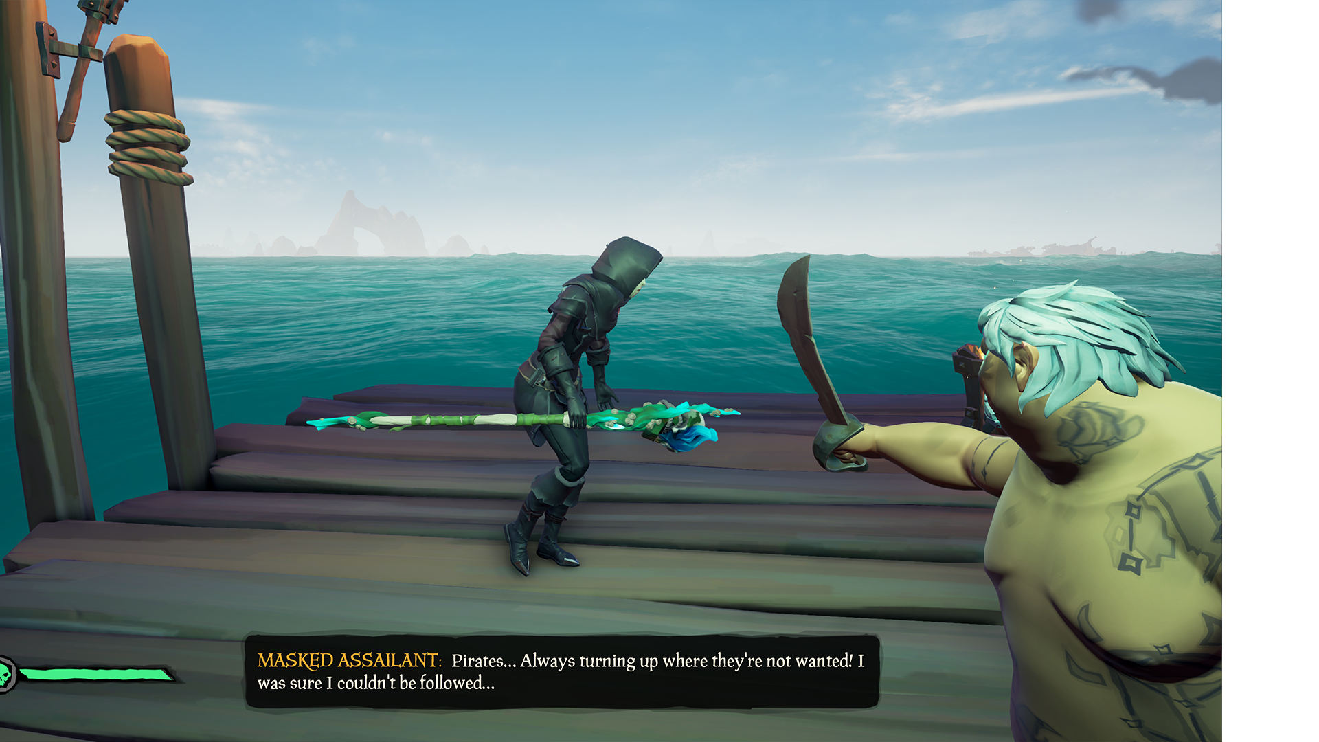 Belle will send you to Sea Dog’s Tavern, the massive structure near the center of the map that formerly housed the Arena. Sail your ship there, but don’t go to the large center island. Instead, aim for the small dock attached to an outlying rock on the Northwest portion of Sea Dog’s Rest. The Masked Assailant is there, ready for you to approach and confront them.