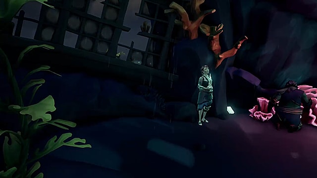 A ghostly pirate stands next to red coral at the base of a craggy tower.