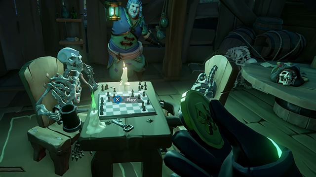 Once that is done, and for reasons that might not be your fault, one of the skeletons heads will suddenly explode. They will also now accept Dougie’s Coin as a buy in. Place the Cursed Captains head on the appropriate skeleton, and he will win the game of chess.