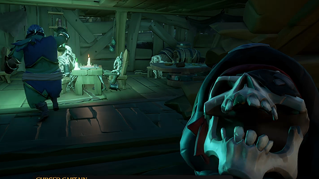 Light the candle on the table, and scene will play out, where one skeleton is out of grog. You will need to bring Captain Bones Special Recipe to refill his tankard, and the head of the Cursed Captain.