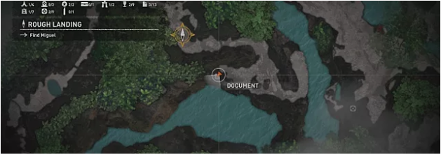 After reaching Kuwaq Yaku and unlocking fast travel, from the original plane wreckage cross over to the far western side of the Peruvian jungle by jumping down into the river from a high cliff. In the center of this area is a small alcove with a salvage box and a document.