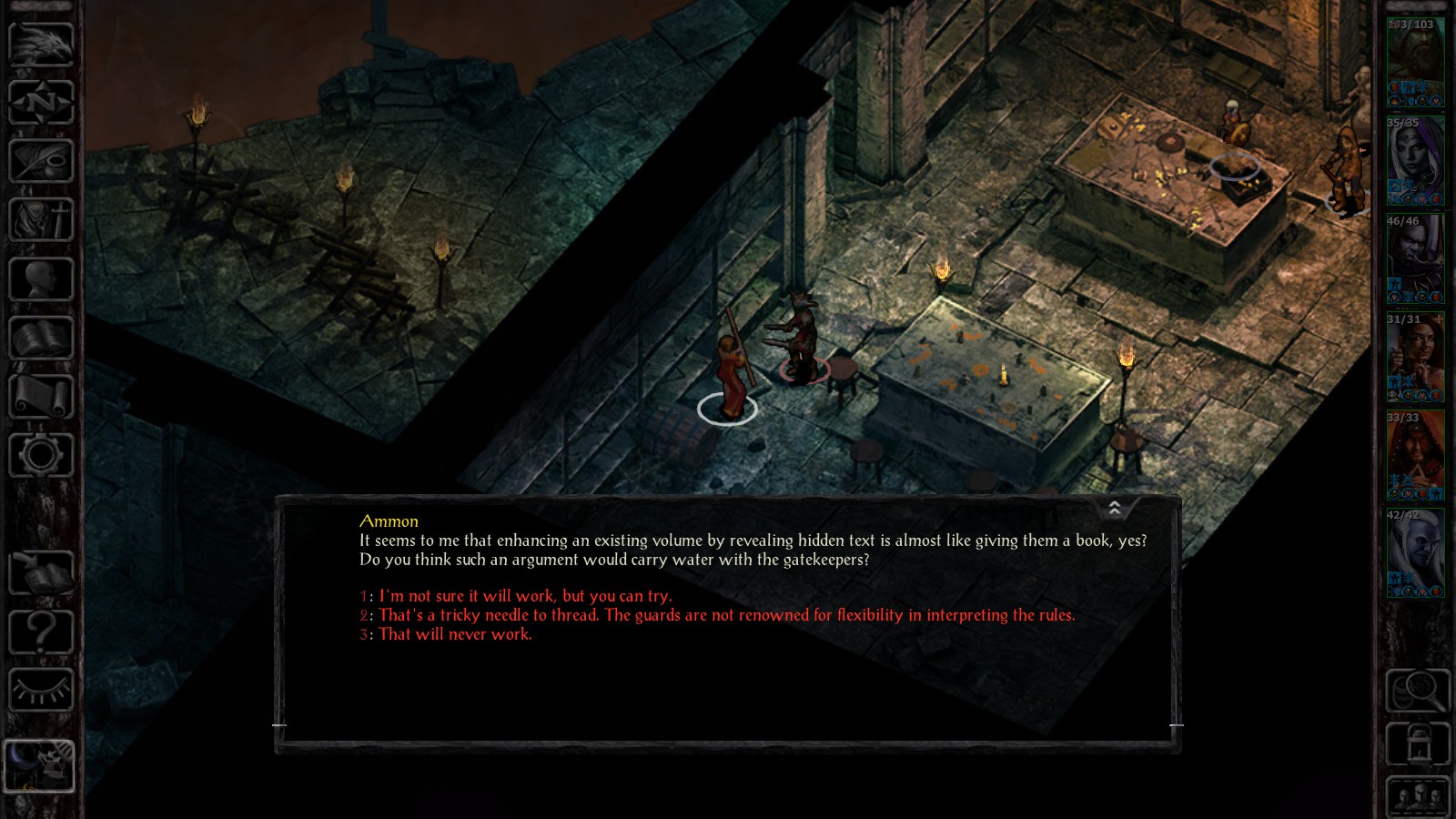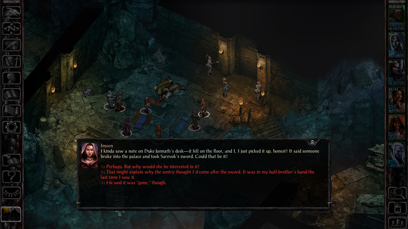 He’ll then hand over the key to the basement. Next, talk to Imoen about what Porios mentioned and she will ask you search for more clues.