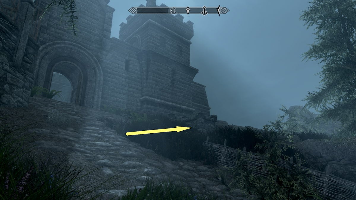 Walk around to the opposite side of this wall and start inspecting the ground in front of it. A few feet away from the wall, at around the fourth or fifth stone on the bottom row, another invisible chest prompt pops up. This chest will include some amazing loot, even including an ebony bow and 1,000 gold.