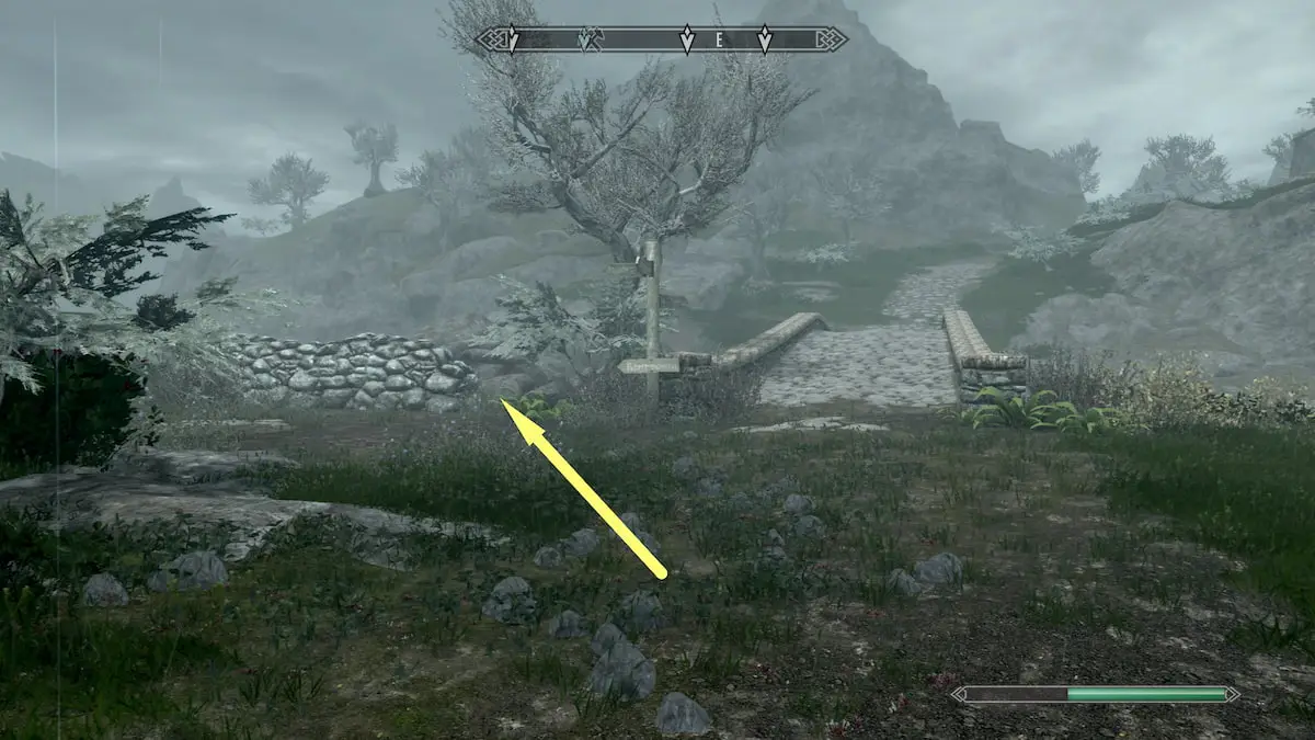 The third invisible chest hides outside Markarth. Fast travel to Markarth stables and follow the cobblestone path away from the city. You’ll have to follow it for a short while, passing the first bridge and waterfall on your right until you reach the second bridge with a sign and a small stone wall. Stop once you get here.