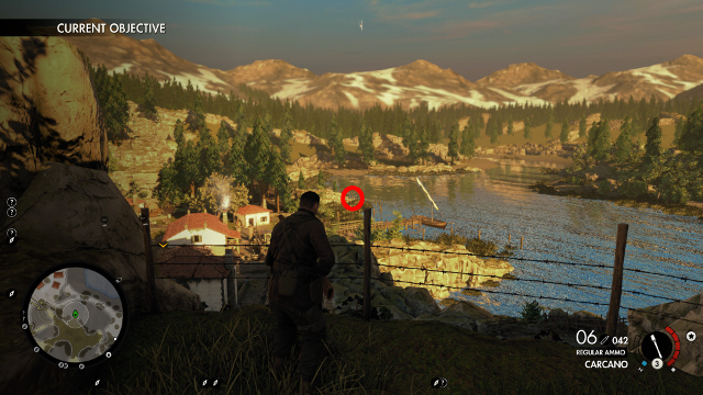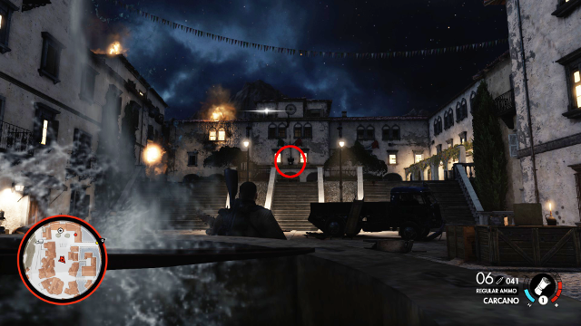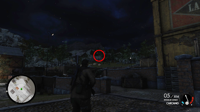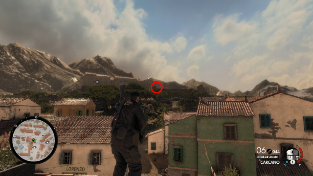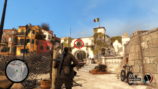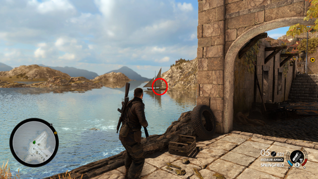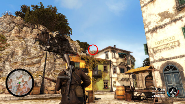 From Stone Eagle 1, go immediately right, through the harbor. But be careful: there is a contingent of Nazi soldiers hiding in the cargo here. Once you’ve cleared the area of enemies, you’ll come to the edge of Bitanti, the village the mission is named after. At the archway pictured above, look for a nook at its zenith. There you’ll find your second deadeye target for this mission.