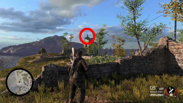 But you don’t have to take these guys out right now to get your next deadeye target. Instead, stop at the top of the road and look to the bunker just ahead of you. To the left of the sniper, perched on top of the bunker, you’ll find your third and final Stone Eagle for this mission.