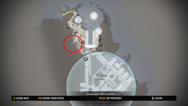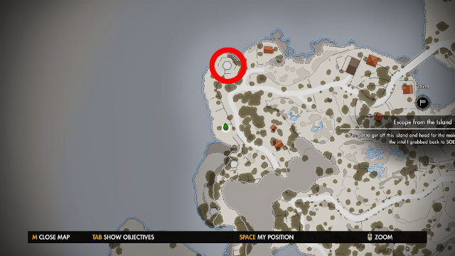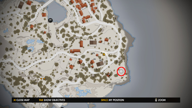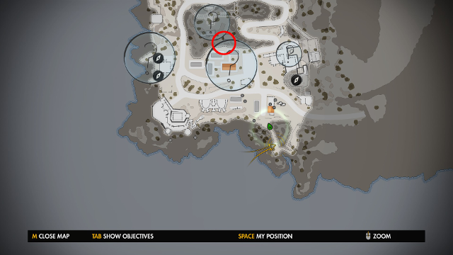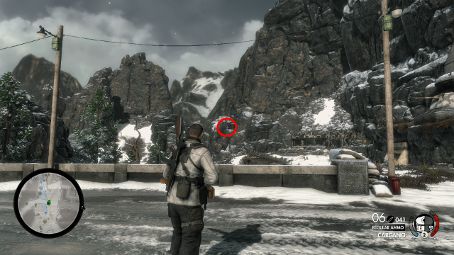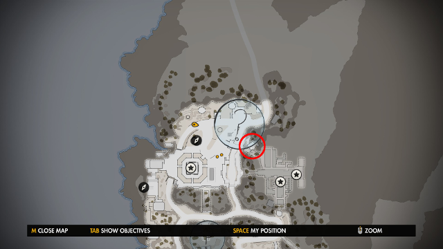 From Stone Eagle 1, go left. You can either go down along the coast and climb up the yellow pipe halfway down, or you can chance going along the top behind the barracks. Whichever route you choose, you’re going to want to go to the second gun emplacement (just before the radio tower in the map’s southwest corner) and turn directly around.