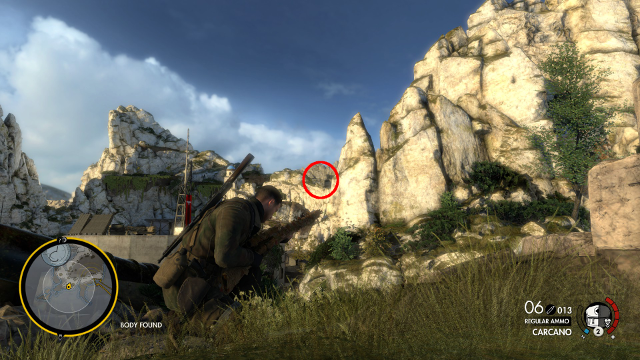From mission start, climb up the earthworks in front of you to reach the map’s main level. From there, go immediately right, toward the bridge that connects to the main facility. After fighting through the troops there stop on the far side of the bridge and look right. There, perched on a stone outcropping, is your first Stone Eagle of the Sniper Elite 4‘s last mission.