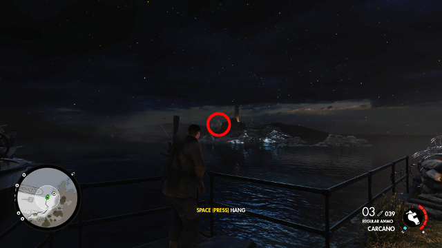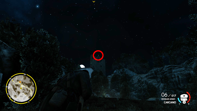 From Stone Eagle 2, continue going clockwise around the map, going through the encampment you’re currently in. Going along the main road, you’ll come to a position on the left with supplies, two Nazi soldiers, and covered spotlight. From this position, look southwest, toward the docks at the bottom of the map. You’ll see another tower (an aqueduct will be in the distance behind it). Look toward the top of the tower, where you’ll find your third and final Stone Eagle for Sniper Elite 4‘s first mission.