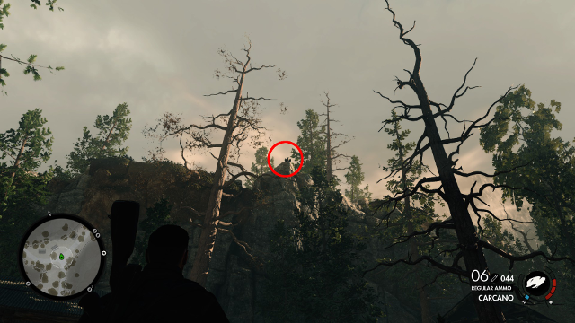 From Stone Eagle one, head along the cliffside and cross the wooden bridge. Just across the bridge, you’ll see an old cannon on the left side. Stand next to that and look toward the base. Up on the cliff, behind the sniper, you’ll find your second deadeye collectible of Sniper Elite 4’s first DLC mission.