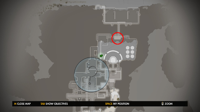 As you begin the mission, come down off the roof and head right and around the corner, minding the two patrolling guards along the way. As you come around the corner, take an immediate left, passing under the portico connecting two buildings and go right and up the stairs. You’ll be in the center courtyard here, so be careful of more Nazi guards.