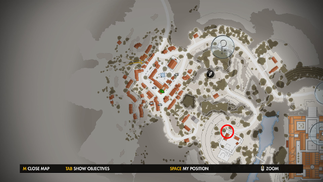 Go to the top of the villa’s main stairs from the road. Stop at the top and look straight across the courtyard. At the top of the next set of stairs across the courtyard, look to the left of the right entryway. There, in a nook, is your final deadeye target of the mission.
