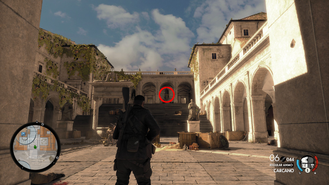 The third Stone Eagle is the easiest to find in the Giovi Fiorini mission. From Stone Eagle 2, go through the town and to “Kill Sniper” objective. But don’t kill the sniper yet! Doing so will automatically end the mission if you’re standing in the square below his position. Also, killing the sniper anytime before that (even from a distance) automatically triggers the end of the mission once you reach the square.