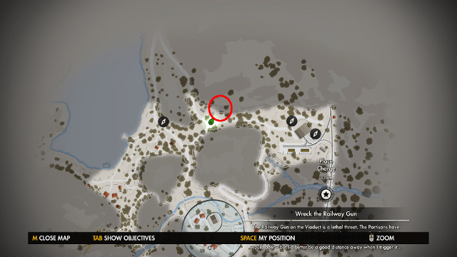 At the start of the mission, head right along the western edge of the map. This area is filled with guards and there’s a pillbox and minefield along the way, so be careful. After you pass through the heavily guarded checkpoint, head toward the railyard and the first “Disable Searchlights” objective. Climb onto the roof of the building with the searchlight on top of it and look into the woods just south of the railyard. There, at eye level, you’ll find your first Stone Eagle perched atop an outcropping of rock.