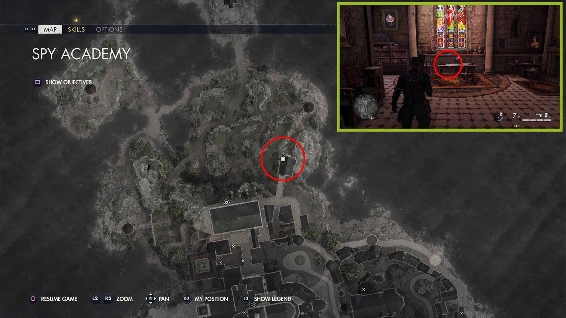 Go straight ahead into the spymaster’s office. Continue upstairs and get Training Scenarios off of the desk underneath the stained glass windows, and retrieve the ornate compass from the safe in the room adjacent to the entrance.