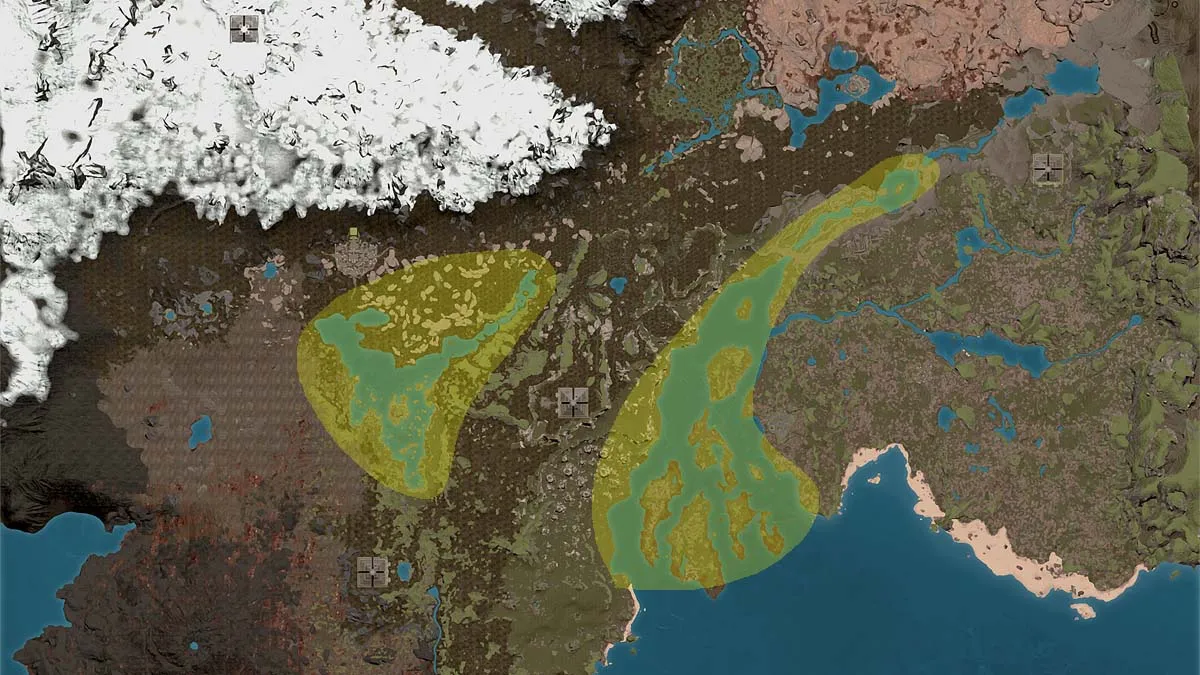 Smaller but potentially more dangerous animals are hiding inside caves and caverns. The only area on the map that has plenty of caves is located in the central west of the map, which I marked with the yellow color above. There, I spotted bats, centipedes, rats, scorpions, and spiders. The flying bats drop claws that can be used for crafting gauntlets, while the centipedes drop venom, which is used in herbicides, pesticides, and poisons. But if you can’t find centipedes, then scorpions and spiders can also drop venom.