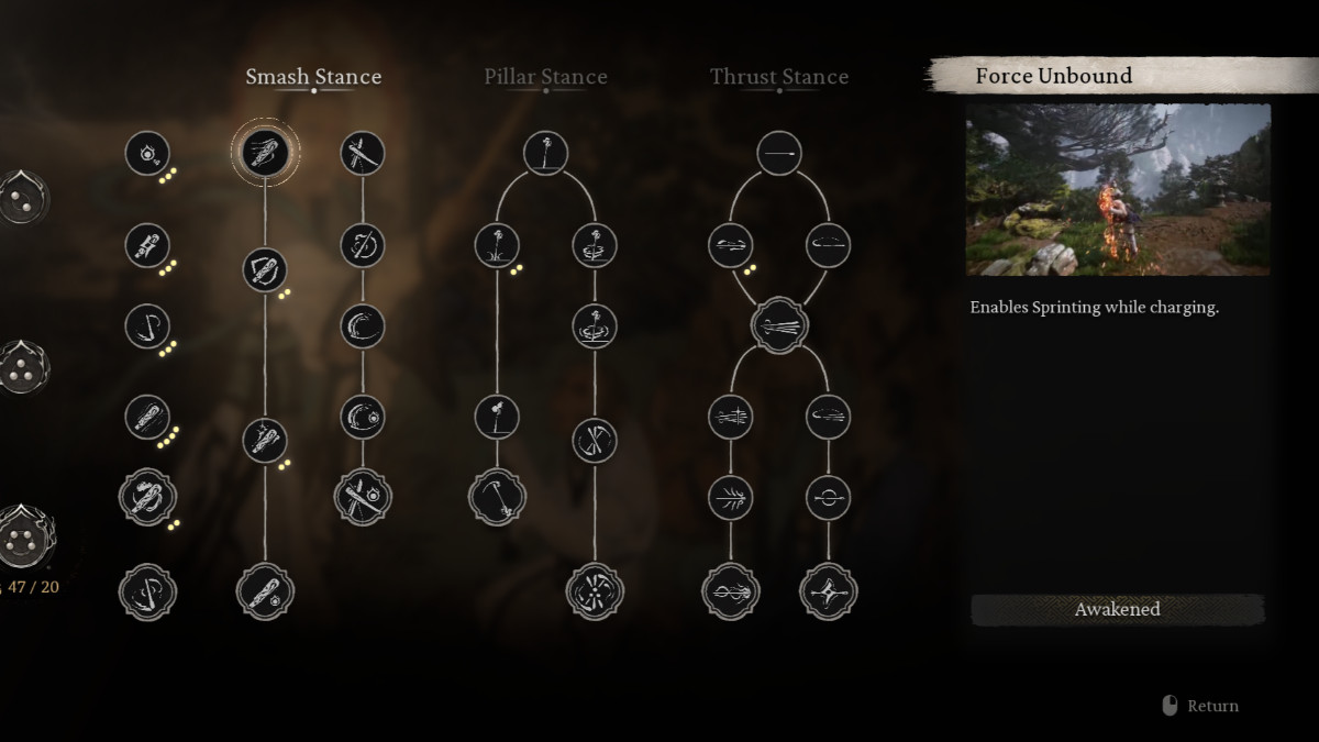 This ability marks the start of the Smash Stance, the only stance available at the start of the game. Smash is also likely to be the main stance you’ll use throughout the game, so specializing in it early on is a good idea. Force Unbound allows you to sprint while charging a heavy attack. Dodging or getting hit interrupts a charging attack, making it essential to hit first, which is why you want to sprint.