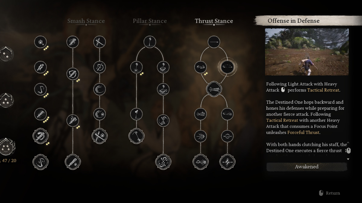 Offense in Defense is one of the first abilities you’ll unlock in the Thrust Stance, and it’s one of the most useful. This ability enables combined combos of light and heavy attacks in the Thrust Stance. Unlike the aggressive Smash Stance, mixing a heavy attack with a light combo results in a Tactical Retreat, which avoids damage and can be followed by a Forceful Thrust.