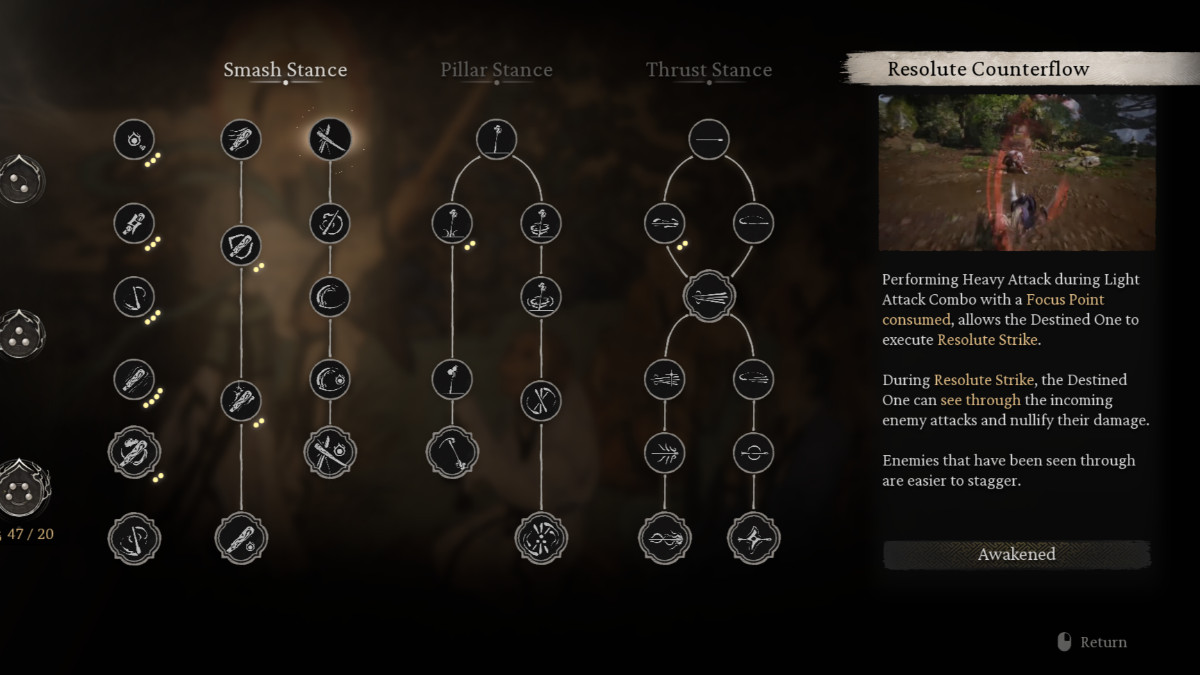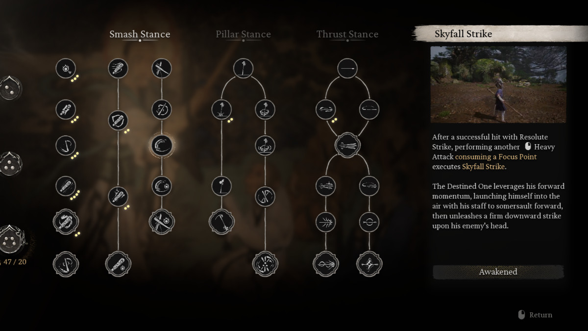 Skyfall Strike comes after Resolute Counterflow in the Smash Stance skill tree and can be thought of as an extension of that skill. It allows you to follow up on the Resolute Counterflow heavy attack with an additional attack, one that deals just as much damage but hits in a much wider area. While this ability is useful to increase damage, it does not carry on Resolute Counterflow’s See Through effect, meaning it does not make you invulnerable to damage if you time the attack well.