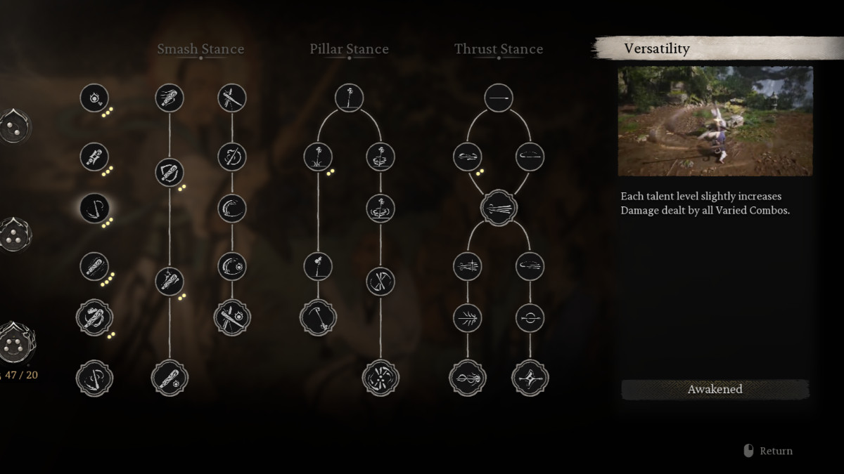 Versatility is one of the most universally useful skills in Black Myth: Wukong. In short, it increases the damage dealt by all varied combos, meaning those that include both light and heavy attacks. In practice, this means that the heavy attacks initiated during a light attack combo get a damage bonus. The reason this is so useful is because it applies to every stance in the game and only costs a handful of points to max out, making it a great early-game investment.