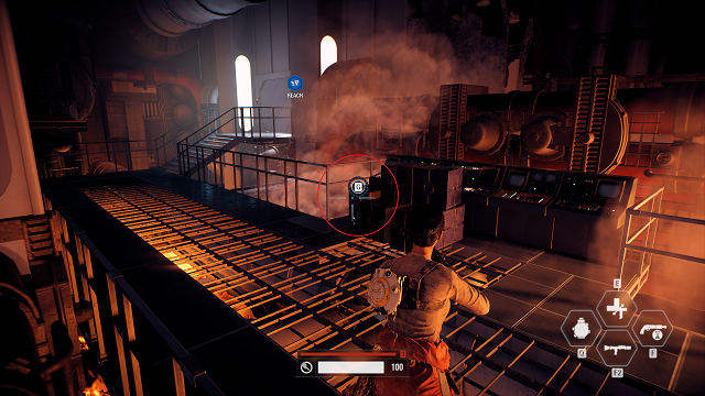 You’ll go a little while in BF2‘s campaign before you’re able to find your next collectible crate. But once you enter The Dauntless and defeat the first group of Rebels in the hangar, you’ll pass a burning A-Wing and X-Wing as you enter the second half of the room. Turn right and look up. You’ll find the box on the ledge above.