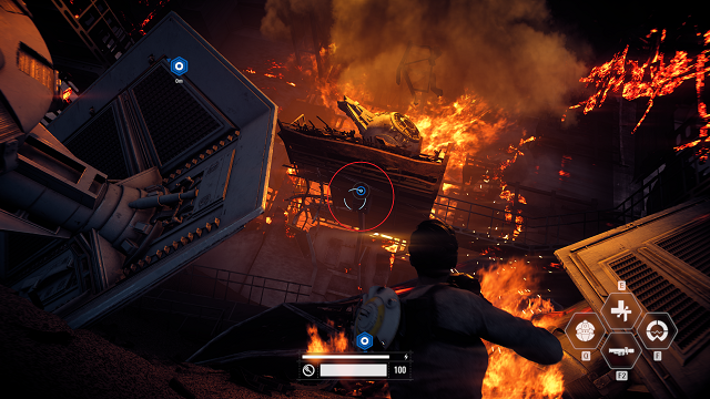 If you do so, you’ll find a downed, burning X-Wing. Go to the back of the platform, along the X-Wing’s right side, to find the fifth — and final — collectible for this mission.