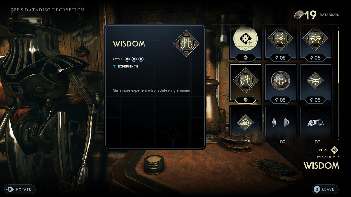 - Wisdom – Increases XP gained from defeating enemies; costs three slots.