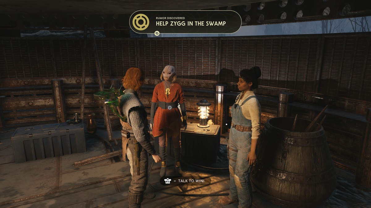 Upon reaching the Viscid Bog, you’ll see their hut. Later, after leaving the Lucrehulk, you can use your Force Lift and Slam to raise a rock formation so you can grab Wini’s Dataslate. This will make the two return to the saloon.