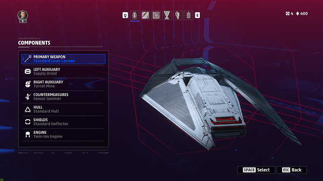 For easy recall (and so you don’t have to scroll back up to the Tie Reaper section), Supply droids are what they sound like; these modules resupply allies with auxiliary weapons and health. Turret mines are autonomous, sustained-fire bots best used when protecting an objective. The sensor jammer is a countermeasure that eliminates an enemy lock and stops other enemy vessels from locking on to you for a short time.