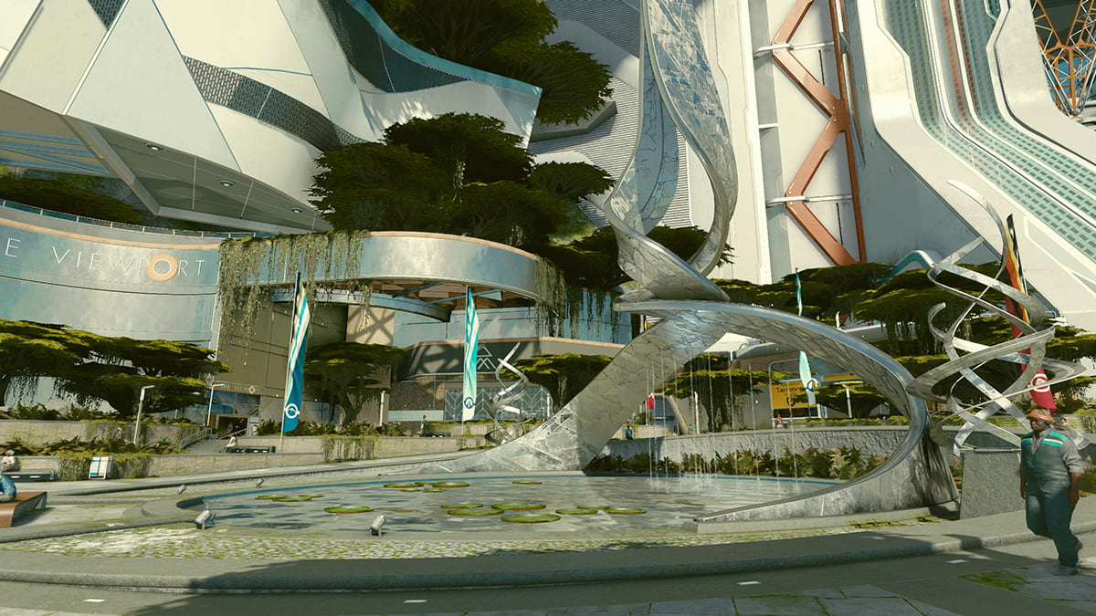 Starfield doesn’t have an in-game benchmark. For my settings research, I used an area in the starting zone of New Atlantis with the fountain and obelisk. It has a good mix of shadows, reflections, crowd density, and other taxing settings.