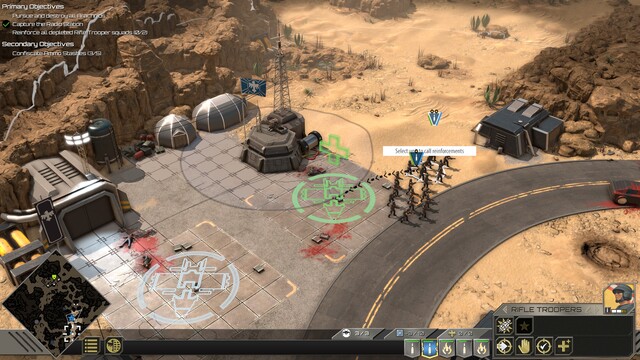 - If a unit takes a bit of damage (i.e., the colored bar to the left of its portrait is yellow or red), you can click on the “Request Reinforcements” button symbolized by a cross.