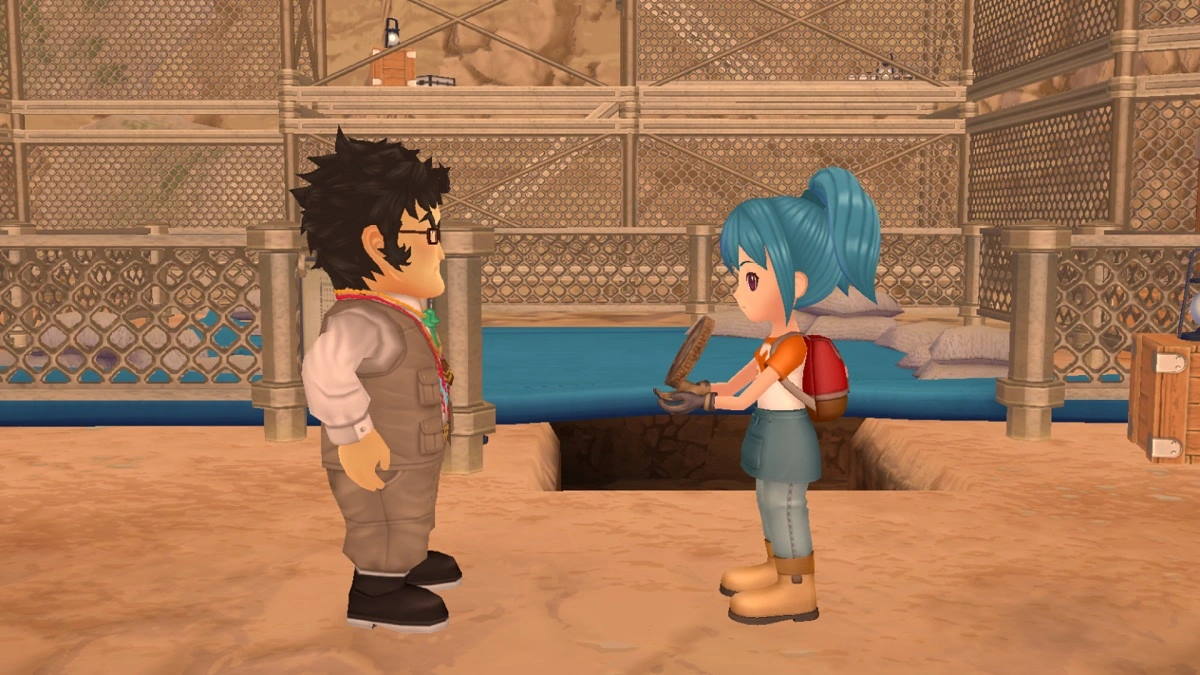 When you enter the Dig Site by interacting with the stairs going down, you can talk to Carter to receive a shovel and start working. The spots that you can dig have cracked ground and will be highlighted when you target them, but Flora and Carter moving around the Dig Site can prevent you from digging in particular spots depending on where they are.