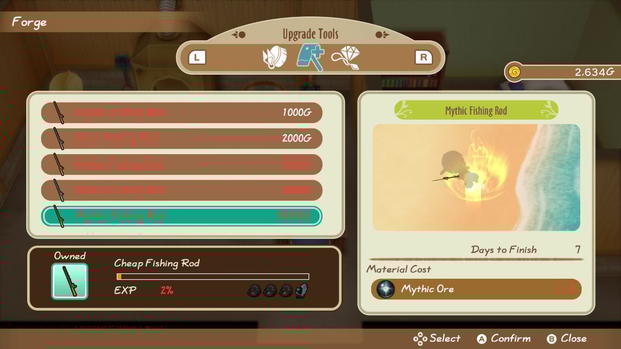 | Mythic Fishing Rod | 1 Mythic Ore, 50,000 G, 7 days (All other tools must be Blessed) |