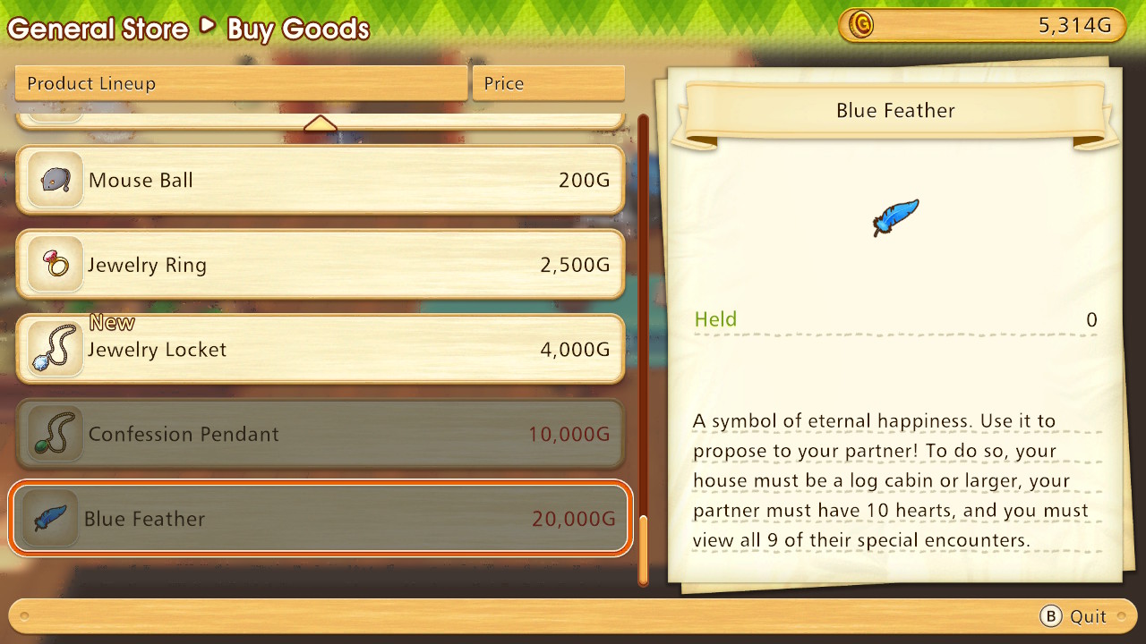 Once you’ve got your house and 10 hearts in order, buy the Blue Feather for 20,000 G at the General Store, and offer it as a gift.