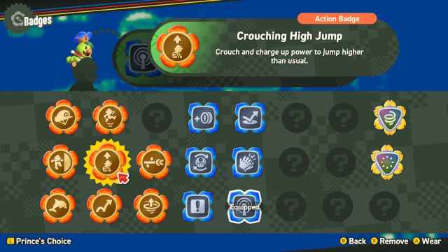 The Crouching High Jump lets you crouch to charge for a higher jump. This is exactly the same as it was in Super Mario Bros. 2. While it can be helpful for reaching higher places, I found myself not needing it as much as other badges on the list.