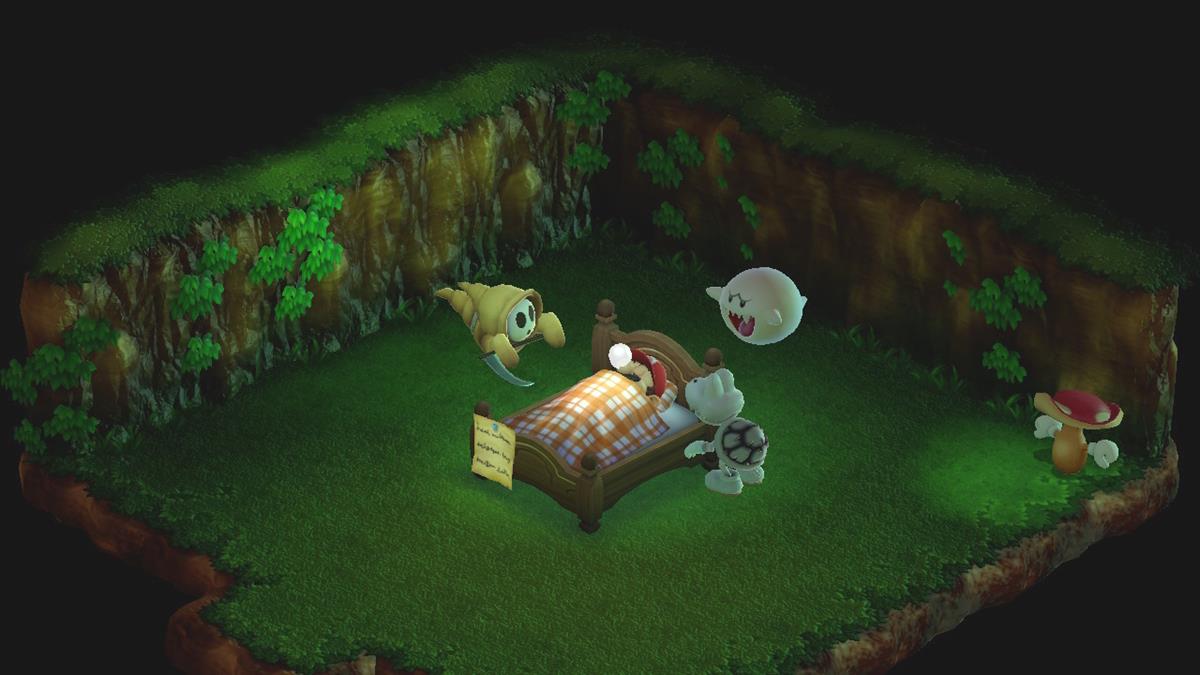 If you interact with the mushroom, Mario will go to sleep. However, in the middle of the night, three ghosts will start chatting about the flags that they’ve hidden in specific locations in the game world.